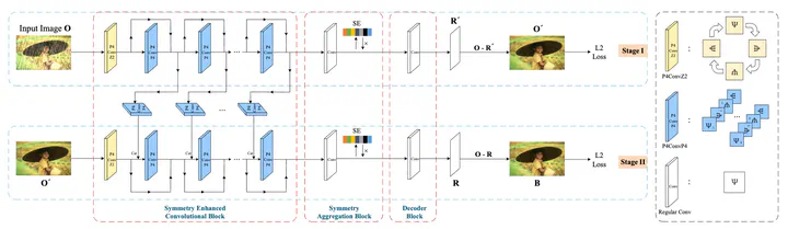 Rain removal aims to remove the rain streaks on rain images. The state-of-the-art methods are mostly based on Convolutional Neural Network (CNN). However, as CNN is not equivariant to object rotation, these methods are unsuitable for dealing with the tilted rain streaks. To tackle this problem, we propose Deep Symmetry Enhanced Network (DSEN) that is able to explicitly extract the rotation equivariant features from rain images. In addition, we design a self-refining mechanism to remove the accumulated rain streaks in a coarse-to-fine manner. This mechanism reuses DSEN with a novel information link which passes the gradient flow to the higher stages. Extensive experiments on both synthetic and real-world rain images show that our self-refining DSEN yields the top performance.
