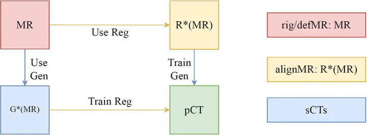 The use of magnetic resonance (MR) imaging for proton therapy treatment planning is gaining attention as a highly effective method for guidance. At the core of this approach is the generation of computed tomography (CT) images from MR scans. However, the critical issue in this process is accurately aligning the MR and CT images, a task that becomes particularly challenging in frequently moving body areas, such as the head-and-neck. Misalignments in these images can result in blurred synthetic CT (sCT) images, adversely affecting the precision and effectiveness of the treatment planning. This study introduces a novel network that cohesively unifies image generation and registration processes to enhance the quality and anatomical fidelity of sCTs derived from better-aligned MR images.