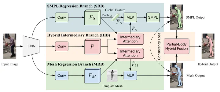 Regression-based 3D human pose and shape estimation often fall into one of two different paradigms. Parametric approaches, which regress the parameters of a human body model, tend to produce physically plausible but image-mesh misalignment results. In contrast, non-parametric approaches directly regress human mesh vertices, resulting in pixel-aligned but unreasonable predictions. In this paper, we consider these two paradigms together for a better overall estimation. To this end, we propose a novel HYbrid REgressor (HYRE) that greatly benefits from the joint learning of both paradigms. The core of our HYRE is a hybrid intermediary across paradigms that provides complementary clues to each paradigm at the shared feature level and fuses their results at the part-based decision level, thereby bridging the gap between the two. We demonstrate the effectiveness of the proposed method through both quantitative and qualitative experimental analyses, resulting in improvements for each approach and ultimately leading to better hybrid results. Our experiments show that HYRE outperforms previous methods on challenging 3D human pose and shape benchmarks.