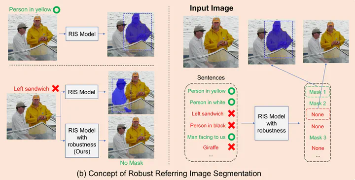Referring Image Segmentation (RIS) is a fundamental vision-language task that outputs object masks based on text descriptions. Many works have achieved considerable progress for RIS, including different fusion method designs. In this work, we explore an essential question, “What if the text description is wrong or misleading?” For example, the described objects are not in the image. We term such a sentence as a negative sentence. However, existing solutions for RIS cannot handle such a setting. To this end, we propose a new formulation of RIS, named Robust Referring Image Segmentation (R-RIS). It considers the negative sentence inputs besides the regular positive text inputs. To facilitate this new task, we create three R-RIS datasets by augmenting existing RIS datasets with negative sentences and propose new metrics to evaluate both types of inputs in a unified manner. Furthermore, we propose a new …